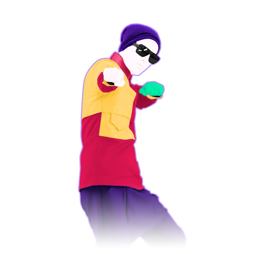 The dancer is a man. He wears a red button down pullover with the left upper part being yellow and yellow lines on the tip of the sleeves, dark purple drop-crotch trousers, and pair of black boots with straps. The coach also wears a dark purple beanie on his head, a pair of sunglasses, and shamrock green glove. He has a purple and white solid outline.