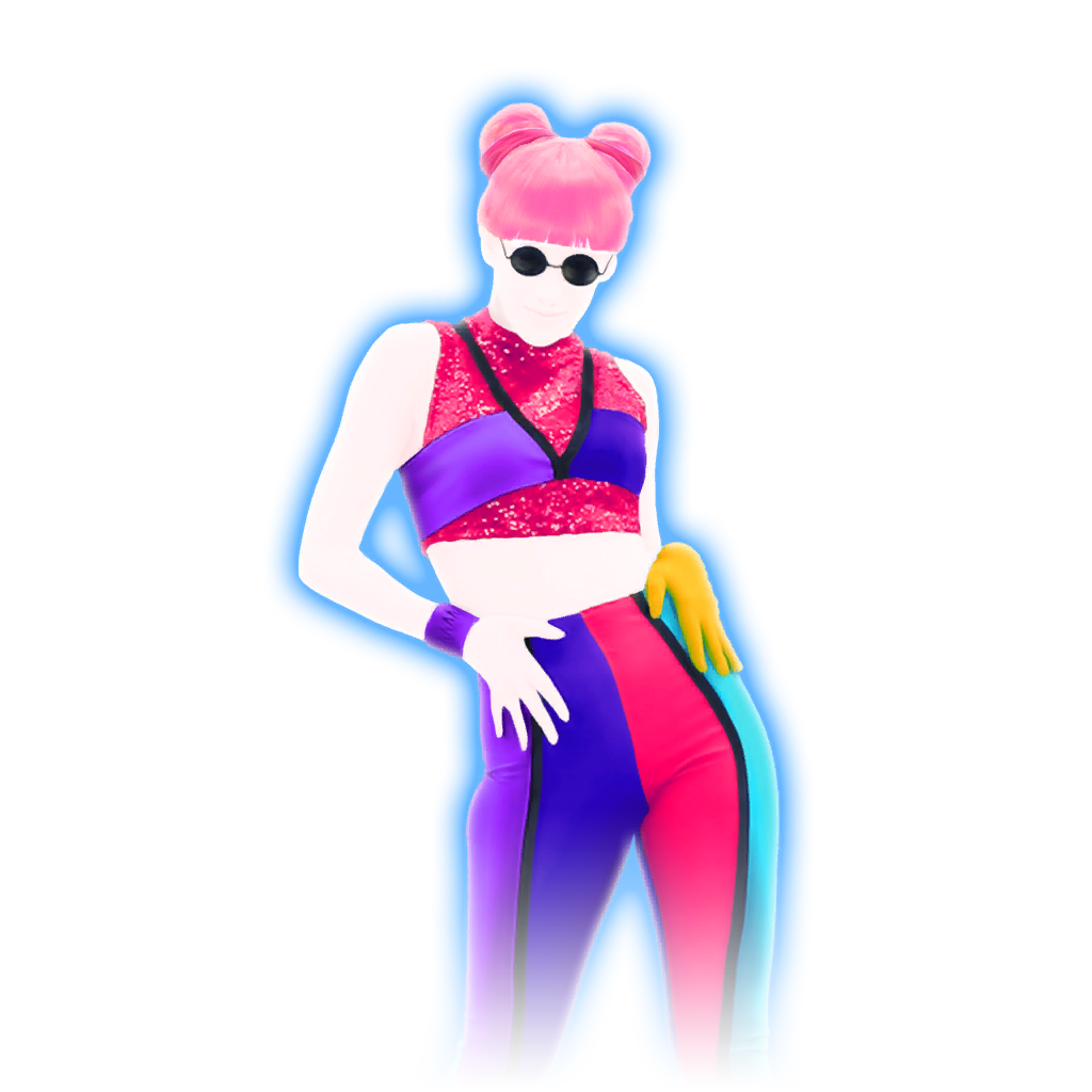 The dancer is a woman with two pastel pink buns on her hair. She has dark rounded sunglasses. Her top is adorned with red sparkles with a light cyan and ocean blue strips and two dark strips. She has a purple bracelet on her left wrist. Her pants are multi-colored in purple, blue, magenta, and cyan. She also wears black leather high boots.