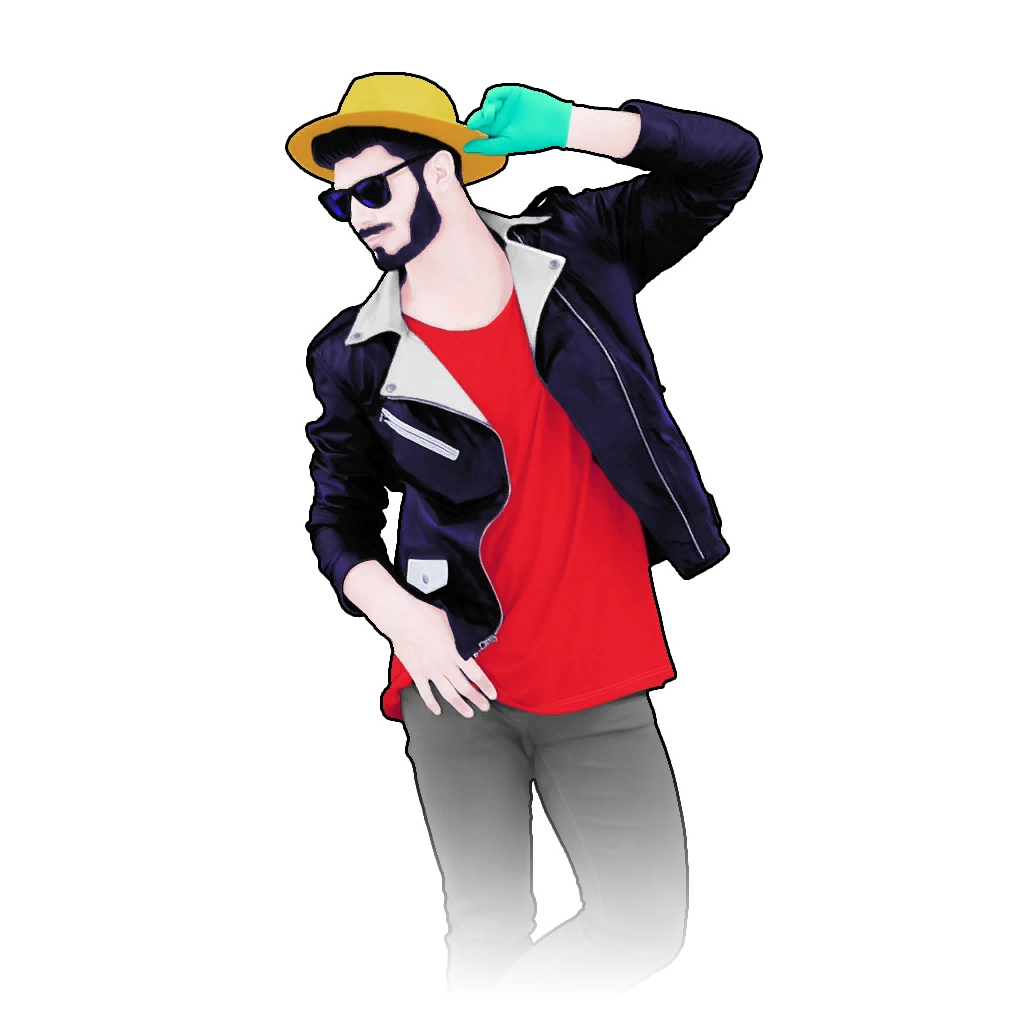 The dancer is a man with black hair and a black beard. He wears a yellow hat, a black and white leather jacket, a red sleeveless shirt, gray skinny jeans, and black boots. During the bridge, he will turn almost completely white.