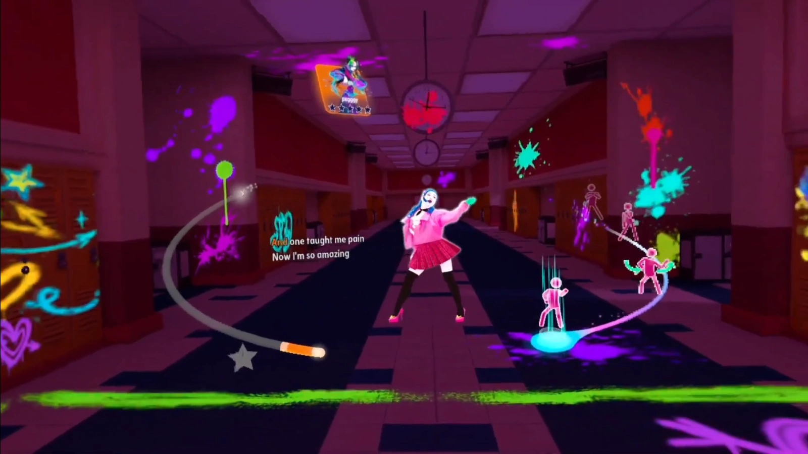 The background starts off with a section of lockers from Just Dance High School[4] with the song title written on it. The camera then transitions to a hallway in the verse, which is the one from Good 4 U. In the pre-chorus the background changes to be darker with graffiti on the walls flashing to the beat.