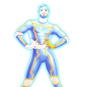 The dancer is a humanoid robot named Neo. He has short space blue hair, beard, and mustache. His body is covered in a sleek, silver metallic suit, with space blue accents defining his muscles, and golden yellow patterns forming across his body and face. The suit is exposed near the waistline, knees, elbows, left hand, and feet. His glove is gold.