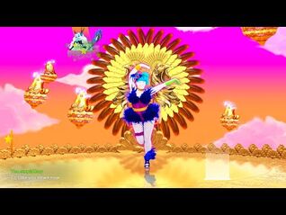 During the bridge, as it leads up to the Gold Move, the background turns dark and the ground has gold circles that expand outwards. Many golden chandeliers also move upwards on the sky. The background in the final chorus has two decorative Roman pillars on both sides. It also has the same circle of feathers and two chicken heads, but they are enlarged and they glow stronger.