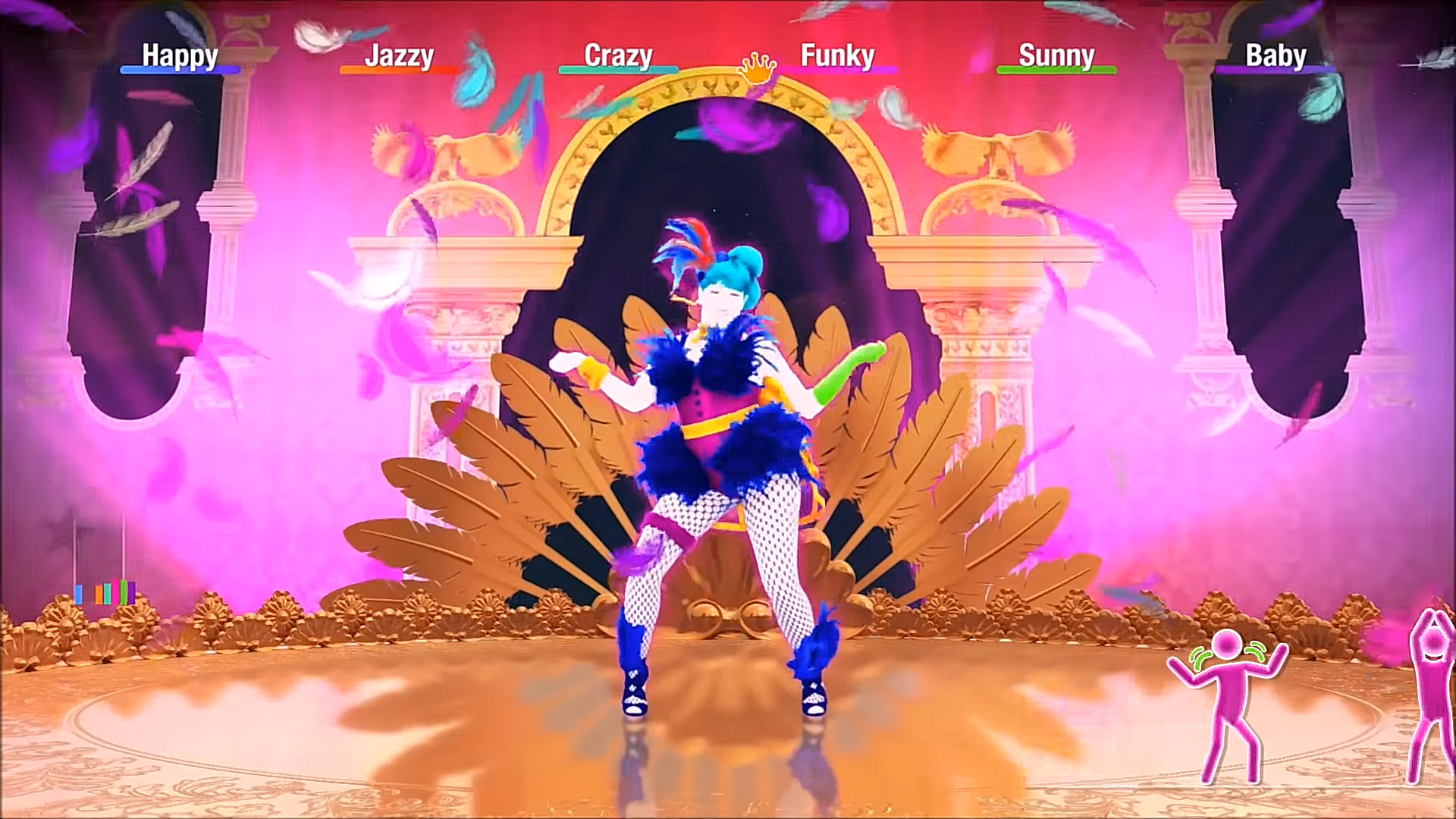 The scene then transitions to a golden entrance with a golden window and a pillar on each side. Many feathers, colored pink, blue, and white, fall from the sky. Pink lights show up according to the dancer’s moves. A blue sky now appears along with golden floating chicken heads. It now turns into a gallery with a golden decorated door and features multicolored chicken portraits clucking to the beat of the song.