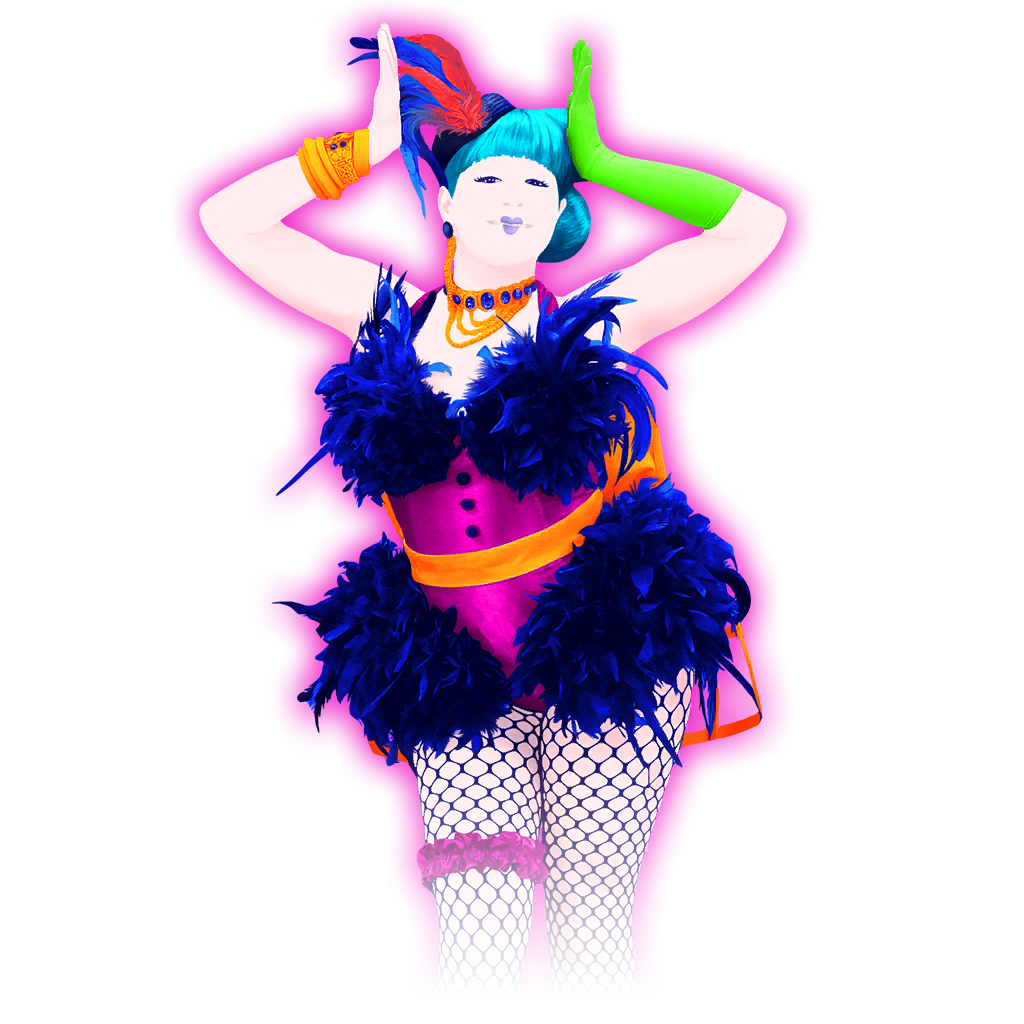 The dancer is Nest. She is a woman with cyan hair done up in two connected buns with straight bangs. It is adorned with a few long red and blue feathers. She wears navy eyeliner and lipstick. Her wardrobe is a rose-purple tube top fitting as a one-piece corset which is adorned with navy feathers around the bosom and pelvis. Strapped around her waist is a golden-yellow bow, tied at the back. The bow connects to a hemispherical crinoline which is exposed and covers her back. On her left ear, she has a singular hanging earring with a navy-blue stud and golden trails. She also wears a golden necklace with a navy stone as well as golden bangles on her left wrist. She also wears navy fishnets and a pair of dark blue heels with blue embellishments. A pair of long navy feathers are attached to her heels as well. She also sports a rose-purple garter on her left leg. She has a long lime green glove and has a magenta outline.