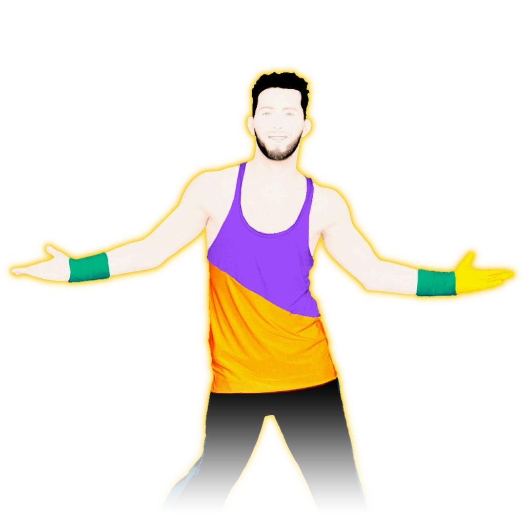 The dancer is a man with a neatly-combed black hair, and a black beard. He wears a tank top with the upper part being purple and the lower part being orange, teal wrist warmers, black jogging pants with dark blue lines on each side, and pair of blue sneakers with white laces and sole. He also wears a Ripe Lemon glove, and a yellow outline.