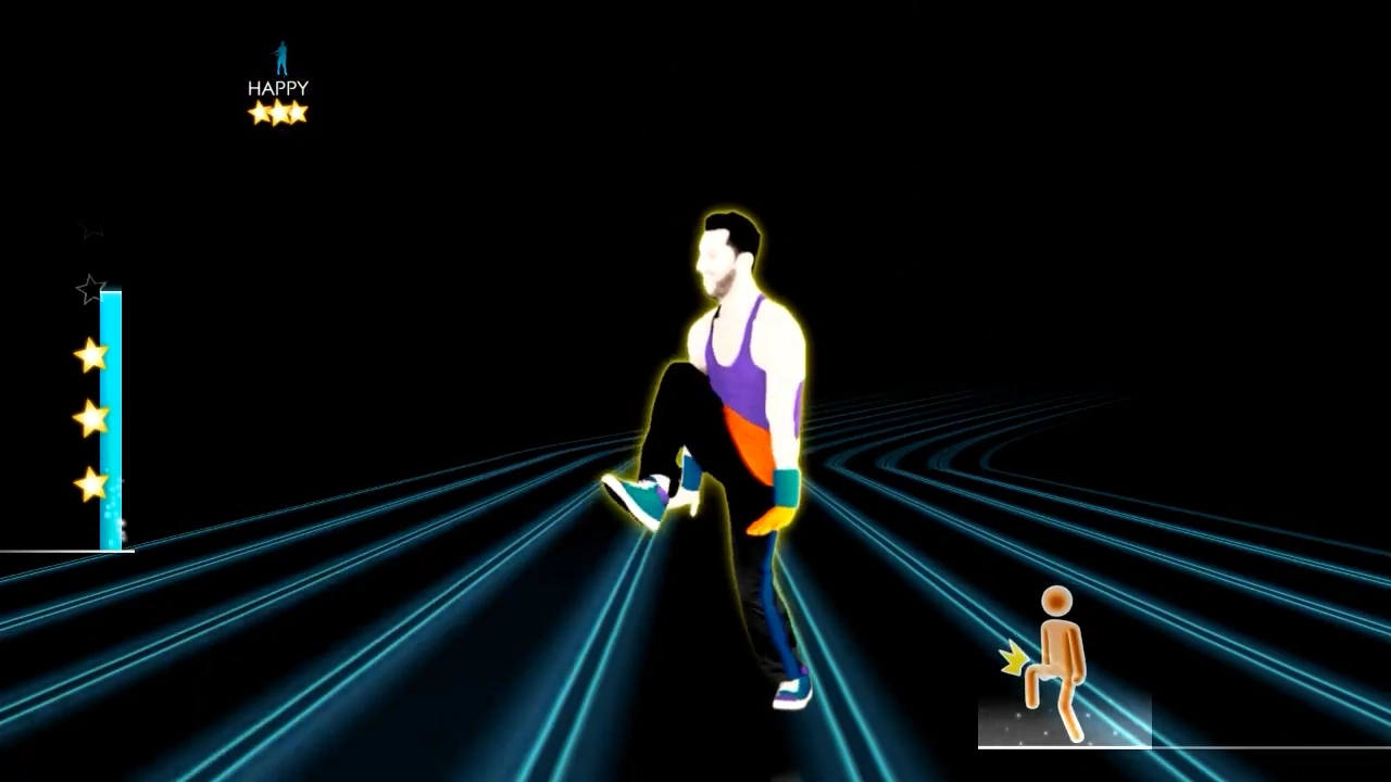 The routine takes place in Dancity Stadium. The background used for all the other Sweat routines. It takes place on a race track that lights up. It flashes orange and purple and has yellow lights running.