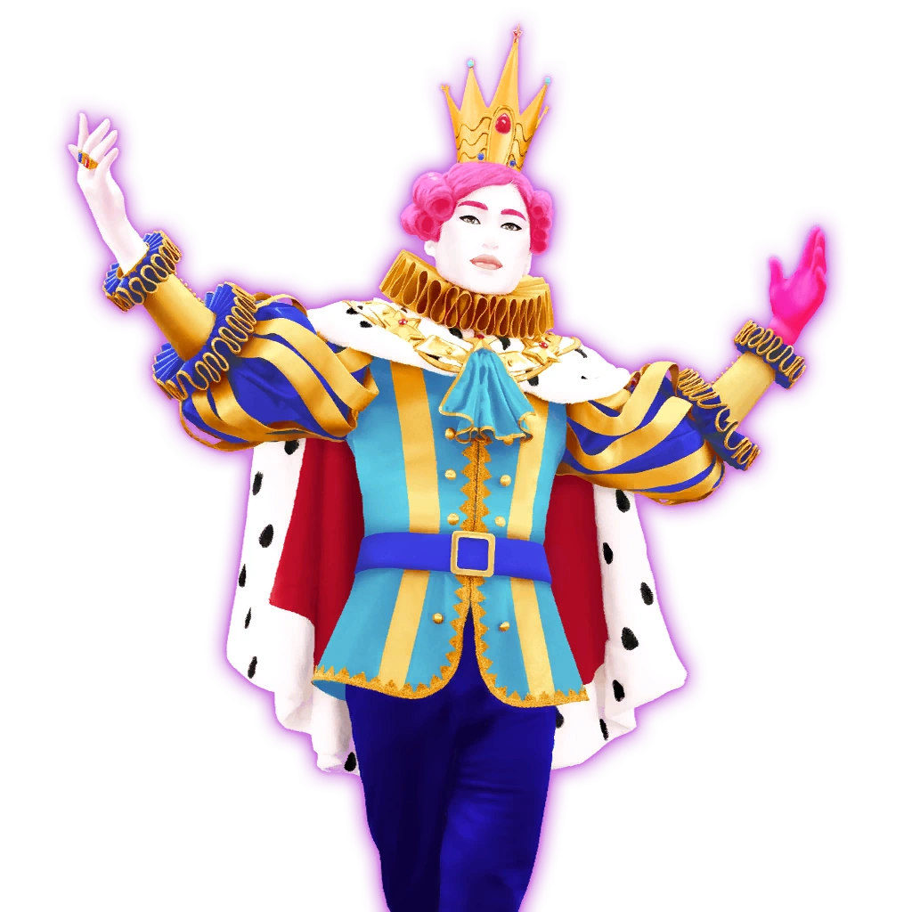 The coach is a young prince named Zéphéon. He has a gold crown embellished with a red, ovular jewel. His hair is pink, and styled like a medieval-era wig worn by royalty with a ponytail at the back. His tunic is striped vertically with gold and light blue, and has a gold zig-zag pattern trim. The upper arms of the tunic are puffy and striped with dark blue and gold. A dark blue belt with a square gold buckle is wrapped around his waist. Wrapped around his shoulders is a red satin cape, thickly bordered with white fur that is lightly dotted with tear-drop shaped black spots. A gold ruffled collar lays atop the cape. More ruffles are found at his wrists and elbows, although they are dark blue with a gold trim. He wears knee-length dark blue trousers and knee-high gold socks, which are adorned with a light blue bow wrapped around the calves. His shoes are dark blue, and are also decorated with a light blue bow at the bridge of the foot. His glove is hot pink.
