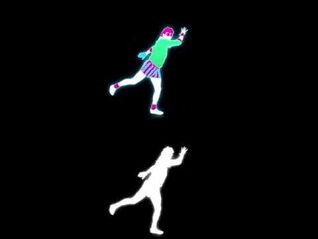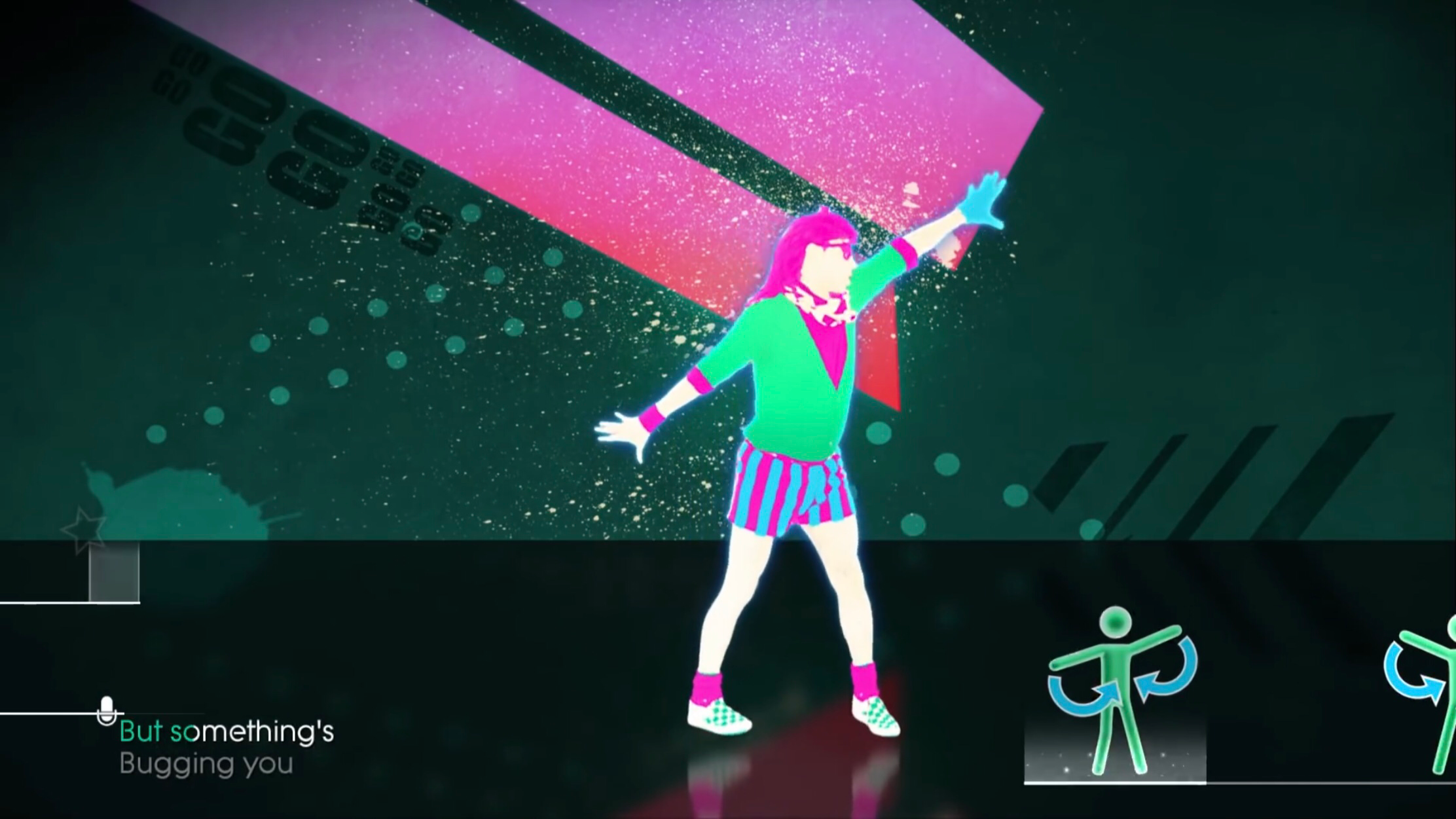 During the intro of the song, the dancer changes color scheme a few times when there is a finger snap: the hot pink parts turn purple and the green parts change to a lime green color.