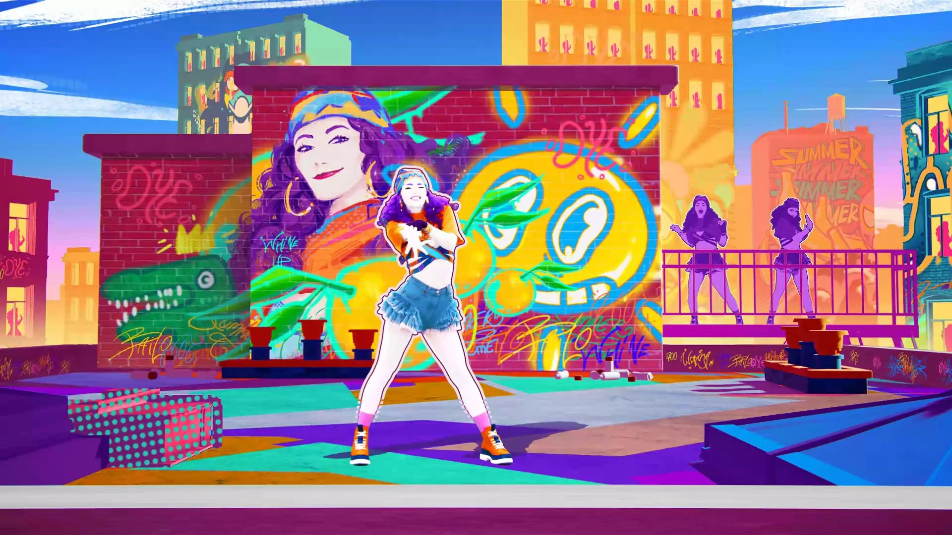 The routine takes place in the same environment as Don’t Cha (Extreme Version), the rooftop of a building in Dancity (resembling the setting in the music video); however, in Whine Up, the walls also have graffiti of Jack Rose and Rouny and Ron, which have been removed from Don’t Cha (Extreme Version). There is also graffiti of the coaches of Que Tire Pa Lante.