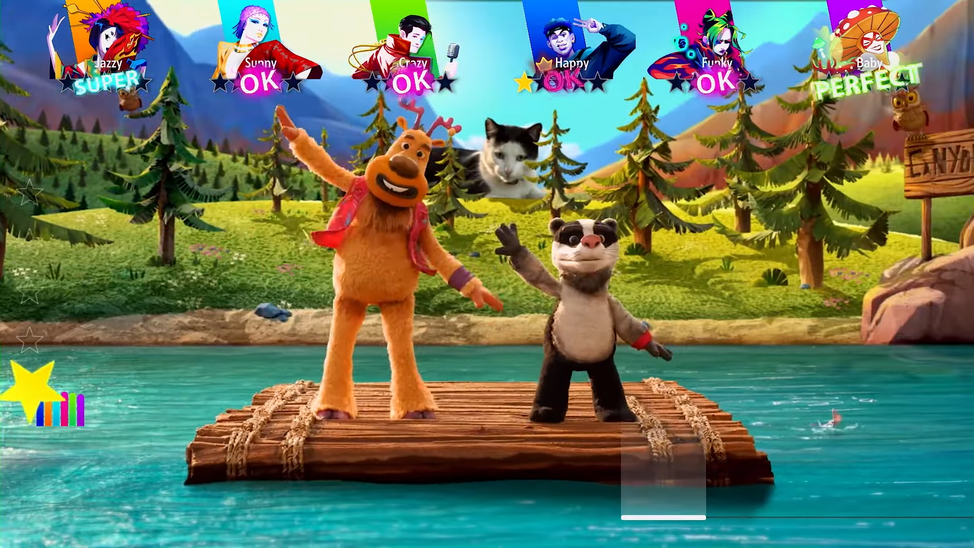 The background shows a river who switches seasons. Winter has the dancers floating on chunks of ice with penguins in the background, two logs appear and the dancers jump on them into a fall forest. A squirrel passes by on a log only to zoom offscreen which the dancers run into the waterfall.